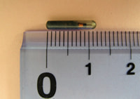 安全で確実に動物の個体識別(身分種名)を可能にする電子標識器具です。外側が成体適合ガラスで覆われ、直径2mm、長さ8〜12mmの大きさで、専用のインジェクター(チップ注入器)で皮下に埋め込んで使用します。それぞれのチップには、世界で唯一の変更不可能な15桁の番号が記録されており、リーダー(読取器)で読み取ることができます。15桁の番号に紐付けられた飼い主さんの名前や電話番号などの多くの情報が、データベースに登録が可能です。