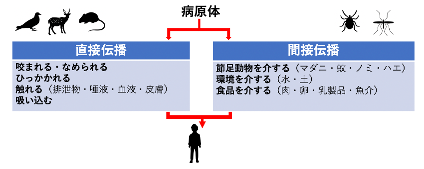 病原体にさらされて、病原体がうつることを「伝播」(でんぱ)といいます。この伝播は、病原体を保有する動物から、直接人にうつる直接伝播(ちょくせつでんぱ)と、病原体を保有する動物と人の間に何らかの媒介物を介して間接的にうつる間接伝播(かんせつでんぱ)の 2つに大きく分けることができます。