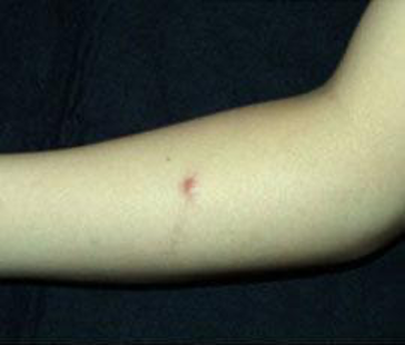 定型例:ほとんどの患者では、咬傷または掻傷から3~10日以内に、受傷部位に痂皮を伴う紅色丘疹(まれに膿疱)が出現する。さらに2週間以内に所属リンパ節腫脹が出現する。リンパ節は初期には硬く圧痛を伴い、その後は内部が液状となり、瘻孔を形成して排膿がみられることもある。リンパ節腫脹に伴って、発熱、倦怠感、頭痛、および食欲不振が生じることがあるが一般的に良性疾患で自然治癒する。