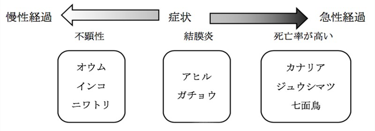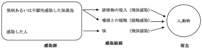 感染様式としては、病鳥の乾燥した排泄物からのC. psittaci の吸入が主体であるが、口移しの給餌や噛まれて感染することもまれにある。